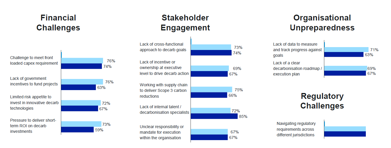 Stakeholder engagement is another area of concern, as 74 per cent of businesses cited a lack of cross-functional approach to decarbonisation goals, 67 per cent reported a lack of incentive or ownership at the executive level to drive decarbonisation action, and 66 per cent identified challenges in working with their supply chain to deliver Scope 3 carbon reductions.